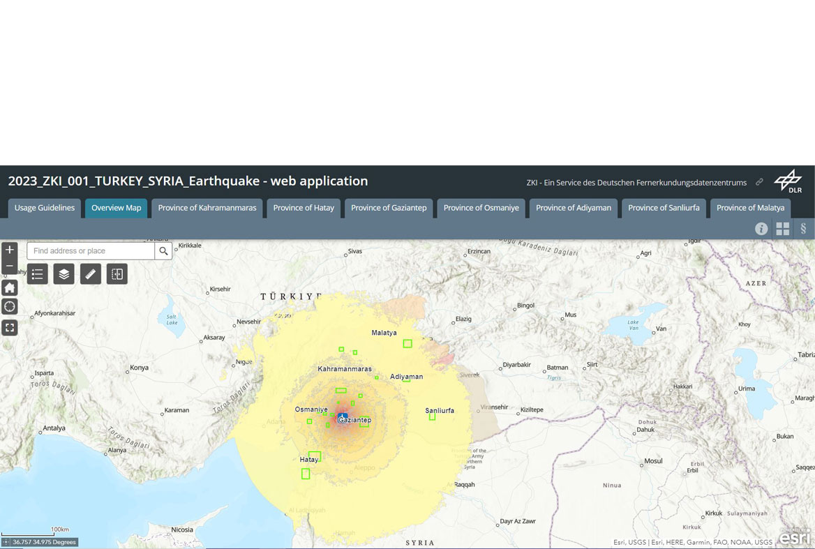 The DLR-ZKI provides a web viewer, where first aid responders, humanitarian actors and governmental agencies for public safety can receive high resolution satellite imagery and DLR-MACS drone data (2-10 cm) as well as their analyses. The application is regularly updated with new data. Users with legitimate interest are invited to contact zki@dlr.de for access to the webviewer.